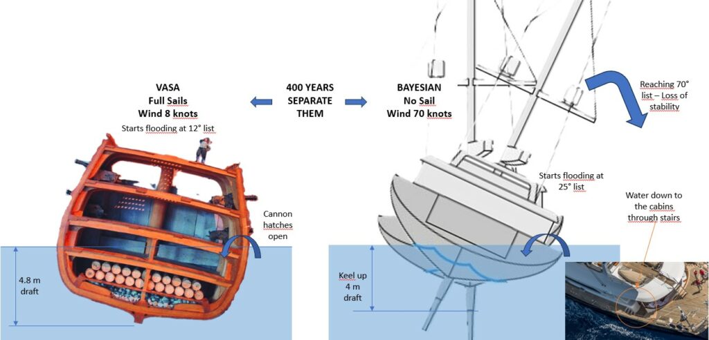 Quel rapport avec le Vasa ? Avec 400 ans d’écart, il semblerait que le Bayesian, comme le Vasa, souffrait d’un problème de conception portant sur la stabilité et les points d’entrée d’eau. Au-delà d’un angle de gite proche de 70 degrés (peut-être moins), la situation était irrécupérable selon le rapport. Il n’est pas improbable qu’un voilier moderne gite à 90 deg, angle auquel les voiles n’offrent plus aucune prise au vent. C’est ce qui est vraisemblablement arrivé le 19 août 2024 au passage d’une tornade. Cette vulnérabilité ne figurait pas dans la documentation technique du bateau. On observe aussi que l’eau pourrait être entrée par la descente d’escalier au bordé qui mène à l’espace cabine, à partir d’un angle de gite de 25°.